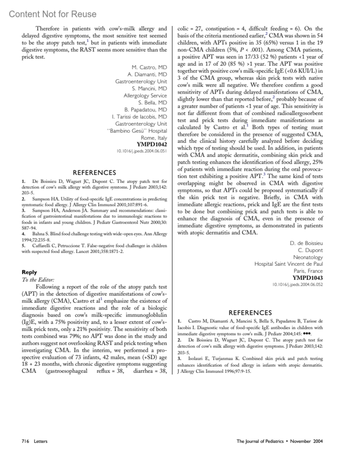 Diagnostic value of food specific IgE antibodies in children with immediate digestive symptoms to cow's milkde Boissieu, D.Dupont, C.Author informationNeonatology, Hospital Saint Vincent de Paul, Paris, FranceYMPD1043Journal of Pediatrics 145(5):p 716, November 2004.Copyright © Mosby-Year Book Inc. 2004. All Rights Reserved.