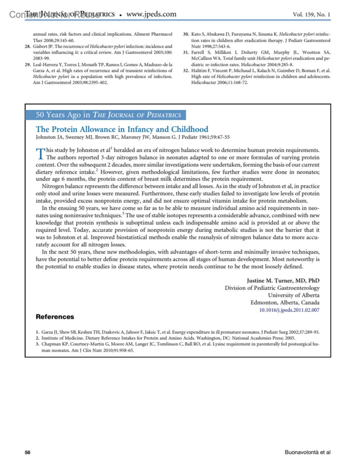 50 Years Ago inThe Journal of PediatricsThe Protein Allowance in Infancy and ChildhoodTurner, Justine M. MD, PhDAuthor informationDivision of Pediatric Gastroenterology, University of Alberta, Edmonton, Alberta, CanadaJournal of Pediatrics 159(1):p 56, July 2011.Copyright © Mosby-Year Book Inc. 2011. All Rights Reserved.