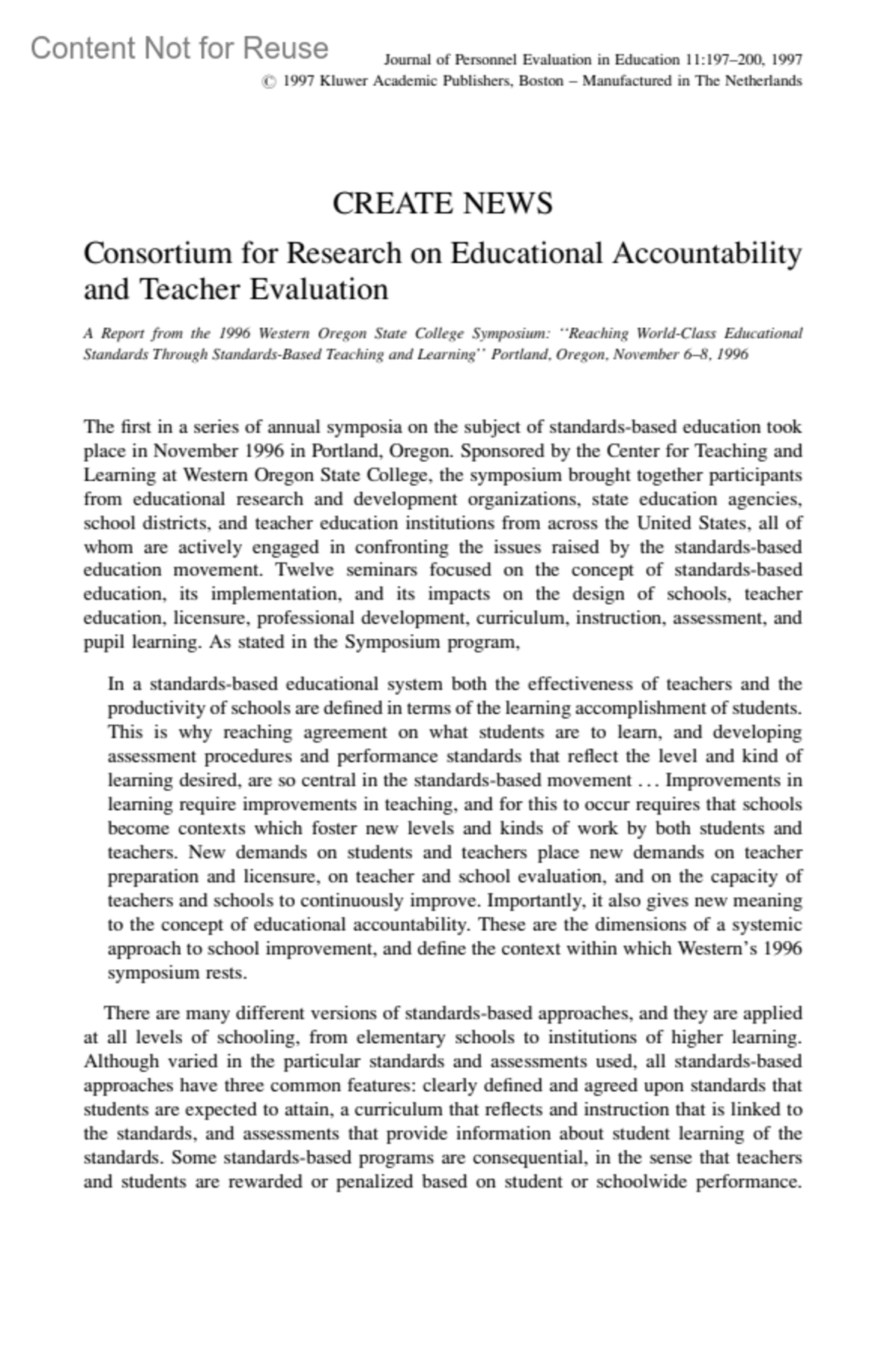 Consortium for Research on Educational Accountability and Teacher EvaluationHorn, Sandra P.Airasian, Peter W.Journal of Personnel Evaluation in Education 11(2):p 197-200, September 1997.Copyright ©1997 Kluwer Academic Publishers