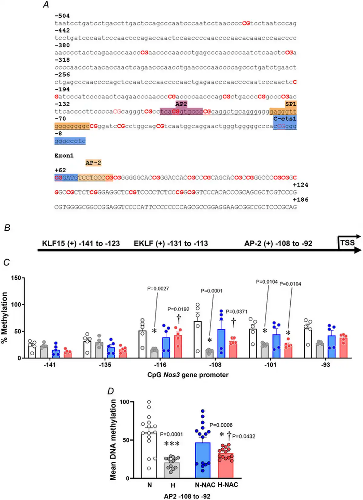 A, Gallus gallus NOS3 gene promoter and first exon sequence (−504 bp from the transcription start site), obtained from the Ensembl genome browser. The binding sites are highlighted, and the related transcription factor is shown above. B, schematic diagram of the G. gallus NOS3 gene promoter predicted with MatInspector. C, dot plots over the mean ± SEM for single‐CpG methylation levels across the NOS3 proximal promoter. D, mean DNA methylation levels in AP‐2 site located at −108 to −92 upstream for abdominal aortas isolated from chicken embryos. Groups are normoxic (N; n = 5), hypoxic (H; n = 5), normoxic treated with NAC (N‐NAC; n = 5) and hypoxic treated with NAC (H‐NAC; n = 5) chicken embryos. Significant differences are vs. N (*P < 0.05 and ***P < 0.001) or H vs. H‐NAC (†P < 0.05) using two‐way ANOVA + Benjamini–Hochberg FDR. [Colour figure can be viewed at wileyonlinelibrary.com]