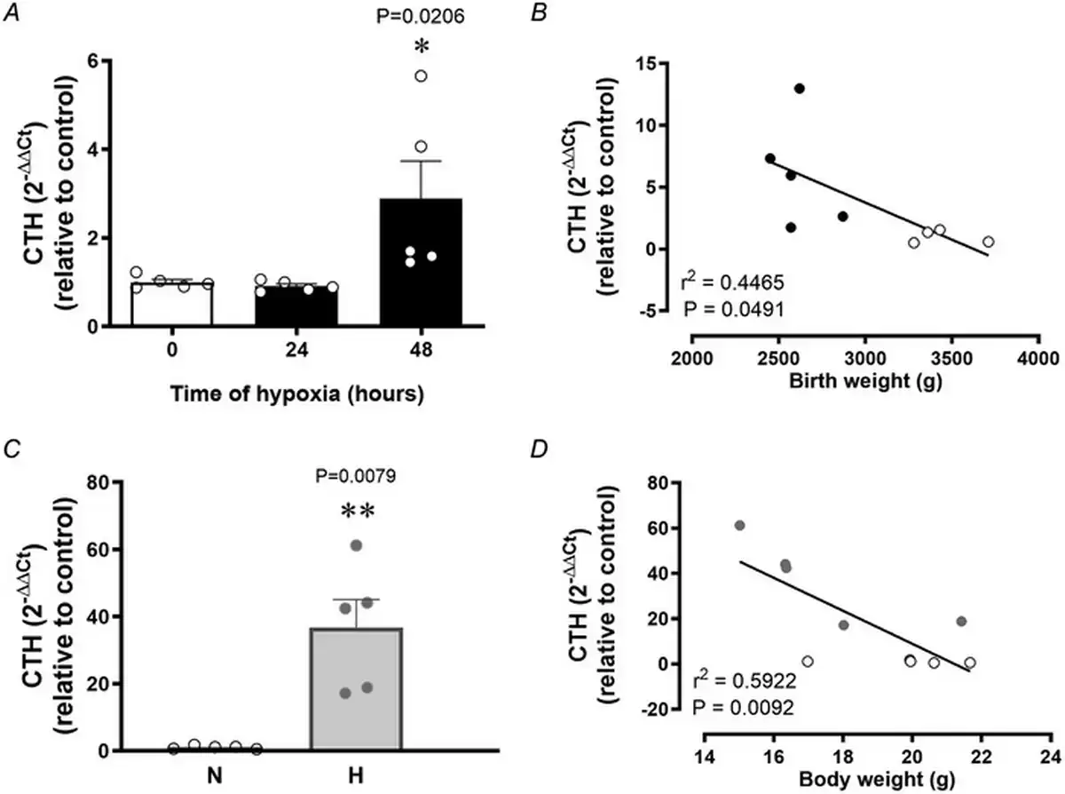 Top: CTH expression in control HUAEC (n = 5 pregnancies) exposed to hypoxia (2%) in vitro at 0, 24 and 48 h (A) and the correlation between HUAEC CTH transcript levels and birth weight in control (open circles) and FGR (solid circles) human infants (B). Bottom: CTH expression in abdominal aortas isolated from near‐term chicken embryos incubated under normoxic (N; n = 5 embryos) or hypoxic (H; n = 5 embryos) conditions (C) and the correlation between CTH transcript levels and body weight in normoxic (open circles) and hypoxic (grey circles) near‐term chicken embryos (D). Significant differences are vs. control HUAEC or normoxic chicken embryos *(P < 0.05) using one‐way ANOVA for (A) and (C), and the Pearson correlation for (B) and (D).