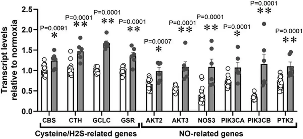 Cysteine/H2S and NO‐related transcripts in HUAEC cultured under standard (21%, n = 15, open bars) or low (3%, n = 5, grey bars) oxygen levels. Significant differences are vs. N (*P < 0.05, **P < 0.01 and ***P < 0.001) using two‐way ANOVA + Benjamini–Hochberg FDR.
