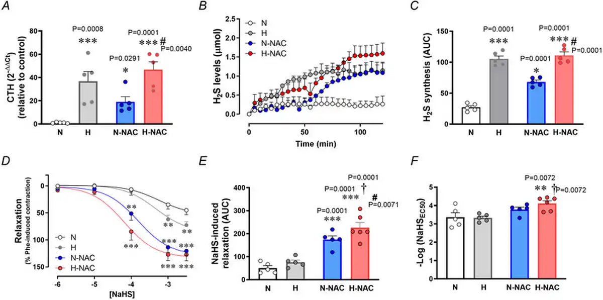 One of the main endogenous antioxidant defences is the tonic synthesis of reduced GSH, which actively participates in the detection, signalling, and reduction of oxidative stress (Winterbourn & Hampton, , ). The ratio of reduced GSH to oxidized glutathione (GSSG) within cells is a robust measure of cellular oxidative stress (Lu, ; Pastore et al., ) where the increased GSSG‐to‐GSH ratio is indicative of greater oxidative stress. NAC is a derivative of the amino acid cysteine and a precursor for the endogenous production of GSH (Elbini Dhouib et al., ). Therefore, previous studies from our group and others have reported potent protective antioxidant effects of NAC on fetal and adult offspring (Hashimoto et al., ; Herrera et al., ; Krause et al., ; Patterson et al., ). However, the precise molecular mechanisms underlying the protection by NAC remain uncertain and, in addition to antioxidant effects (Aldini et al., ), they may include the generation of substrates for H2S synthesis (Ezerina et al., ). This is because the synthesis of H2S in vascular tissues is primarily catalysed by the activity of CTH, which in turn uses thiol‐containing substrates derived from cysteine or GSH metabolism (Kanagy et al., ). Upon endothelial stimulation, H2S has immediate effects as an endothelial‐derived vasorelaxant gas, with effects comparable to NO in vascular homeostasis (Yang & Wang, ; Yang et al., ).