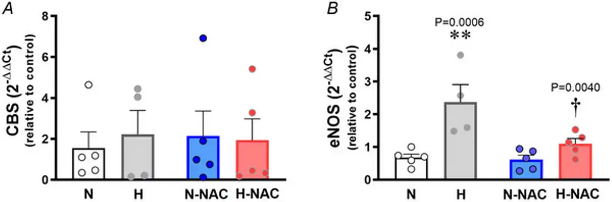 Values are dot plots over the mean ± SEM for mRNA levels of cystathionine‐β‐synthase (CBS) (A) and mRNA levels of endothelial nitric oxide synthase (eNOS) (B) in abdominal aortas isolated from chicken embryos. Groups are normoxic (N; n = 5), hypoxic (H; n = 5), normoxic treated with NAC (N‐NAC; n = 5) and hypoxic treated with NAC (H‐NAC; n = 3) chicken embryos. Significant differences are vs. N (**P < 0.01) and H vs. H‐NA (†P < 0.05) using two‐way ANOVA + Benjamini–Hochberg FDR. [Colour figure can be viewed at wileyonlinelibrary.com]