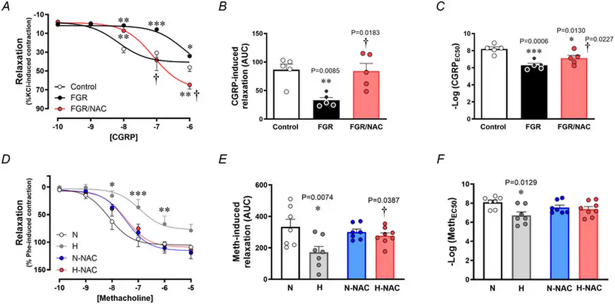Top: relaxant responses to the endothelium‐dependent vasodilator CGRP (A), the cumulative vasodilatation, expressed as area under the curve (AUC) (B) and the potency (–logEC50) (C) in chorionic arterial vessel segments from control (n = 5, open symbols) and FGR pregnancies with (n = 5, red symbols) and without (n = 5, black symbols) NAC pretreatment. Bottom: relaxant responses to the endothelium‐dependent vasodilator methacholine (D), the cumulative vasodilatation (AUC) (E) and the potency (–logEC50) (F) in femoral arteries isolated from chicken embryos incubated under normoxic (N; n = 5–7 embryos), hypoxic (H; n = 5–7 embryos), normoxic with NAC treatment (N‐NAC; n = 5–7 embryos) or hypoxic with NAC treatment (H‐NAC; n = 5–8 embryos) conditions. Significant differences are vs. N or Control (*P < 0.05, **P < 0.01, ***P < 0.001), FGR vs. FGR/NAC (†P < 0.05) or H vs. H‐NAC (†P < 0.05) using one‐ or two‐way ANOVA + Benjamini–Hochberg FDR. [Colour figure can be viewed at wileyonlinelibrary.com]