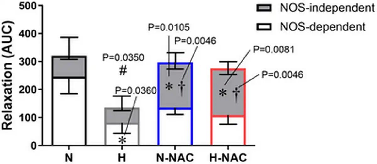 The bar chart represents the mean ± SEM for the area under the curve (AUC) for the relaxation to methacholine in the absence and presence of the NOS‐inhibitor L‐NAME in femoral arteries isolated from chicken embryos incubated under normoxic (N; n = 5–7 embryos), hypoxic (H; n = 5–7 embryos), normoxic with NAC treatment (N‐NAC; n = 5–7 embryos) or hypoxic with NAC treatment (H‐NAC; n = 5–8 embryos) conditions. The overall histogram with positive SEM represents the overall relaxation. The grey compartmental histogram with negative SEM represents the AUC for NOS independent mechanisms. The white compartmental histogram with negative represents the AUC for NOS‐dependent mechanisms. Significant differences are vs. the corresponding component in N (*P < 0.05) vs. the corresponding component in H (†P < 0.05) and vs. the total AUC in N (#P < 0.05) using two‐way ANOVA + Benjamini–Hochberg FDR. [Colour figure can be viewed at wileyonlinelibrary.com]