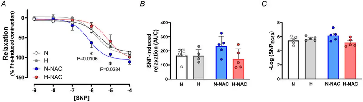Values are the mean ± SEM and dot plots over histograms for relaxant responses to the NO donor SNP (A), cumulative vasodilatation [area under the curve (AUC)] (B) and potency (–logEC50) (C) in femoral arteries isolated from chicken embryos. Groups are normoxic (N; n = 5–7), hypoxic (H; n = 5–7), normoxic treated with NAC (N‐NAC; n = 5–7) and hypoxic treated with NAC (H‐NAC; n = 5–8) chicken embryos. Significant differences are vs. N (*P < 0.05) using two‐way repeated measures ANOVA + Benjamini–Hochberg FDR. [Colour figure can be viewed at wileyonlinelibrary.com]