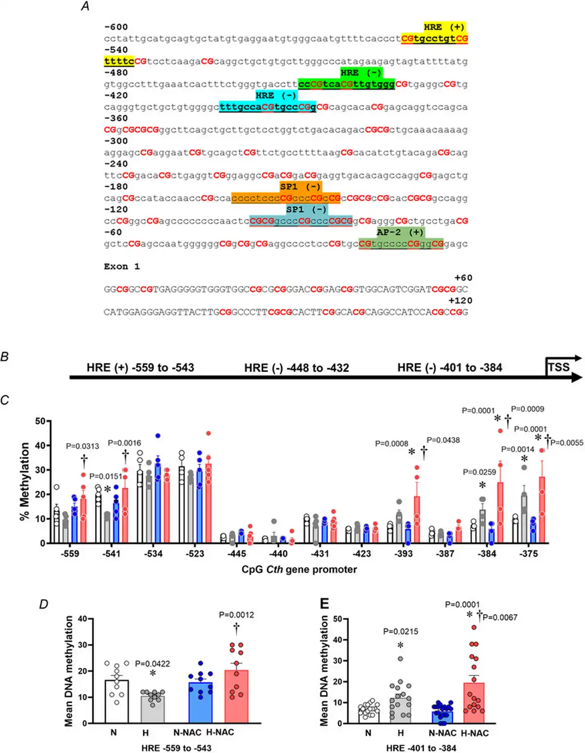 A, Gallus gallus CTH gene promoter (−600 bp from the transcription start site) and first exon sequence obtained from Ensembl genome browser. Binding sites are highlighted, and the related transcription factor is shown above. B, schematic diagram of the G. gallus CTH gene promoter predicted with MatInspector. C–E, abdominal aortas isolated from chicken embryos incubated under normoxic (N; n = 5 embryos), hypoxic (H; n = 5 embryos), normoxic with NAC treatment (N‐NAC; n = 5 embryos) or hypoxic with NAC treatment (H‐NAC; n = 5 embryos) conditions. C, dot plots over the mean ± SEM values for single‐CpG methylation levels across the CTH proximal promoter. D, mean ± SEM for DNA methylation levels in HRE sites located between −559 and −543. E, mean ± SEM for DNA methylation levels in HRE sites located between −401 and −384. Significant differences are vs. N (*P < 0.05) or H vs. H‐NA (†P < 0.05) using two‐way ANOVA + Benjamini–Hochberg FDR. [Colour figure can be viewed at wileyonlinelibrary.com]