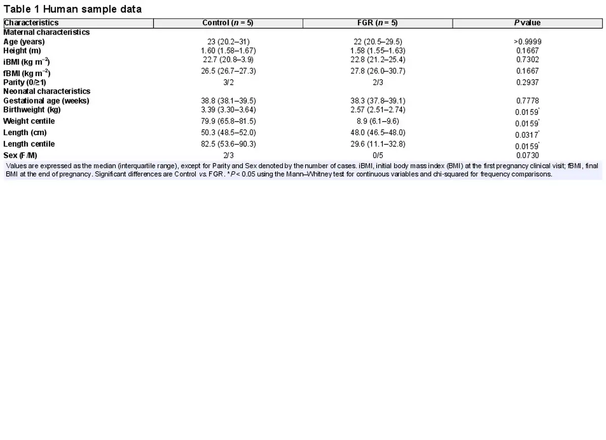 Umbilical cord and placenta samples were obtained from patients after written informed consent. Tissue was collected after delivery from singleton healthy term pregnancies (control group) and from pregnancies diagnosed with FGR, according to current clinical standard criteria (Lees et al., ). Normotensive pregnant women taking part in the study were non‐smokers who did not drink alcohol or take drugs during pregnancy or did not develop intrauterine infection or any other medical or obstetric complication. Gestational age was estimated by ultrasonography before week 12 of pregnancy. FGR was defined as fetal body weight below the tenth centile adjusted for gestational age and sex, together with a low abdominal circumference and/or abnormal Doppler recordings (Gordijn et al., ). Maternal and neonatal characteristics (Table 1) were recorded to confirm the prenatal diagnoses and the centiles were calculated using the web‐based app from Intergrowth‐21st (http://intergrowth21.ndog.ox.ac.uk/en/ManualEntry/Compute).