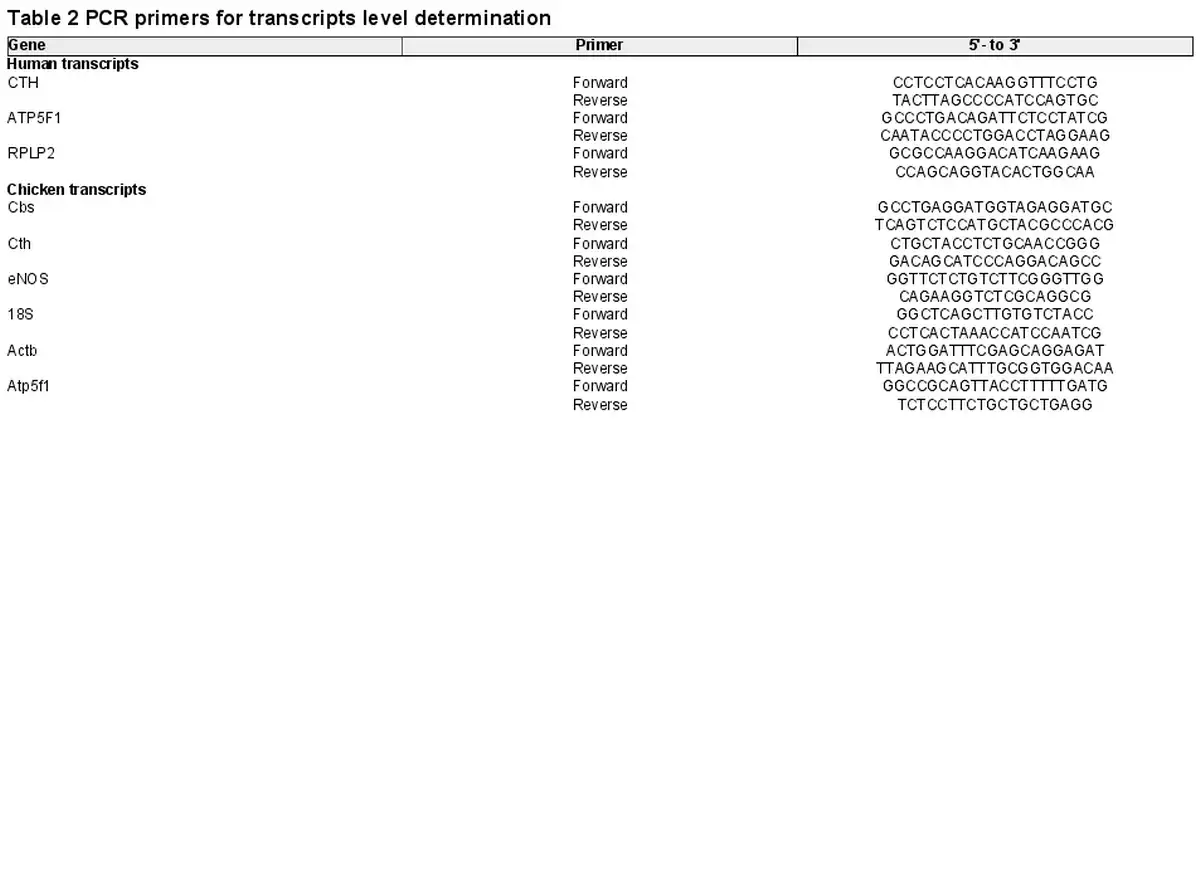 Total RNA was isolated using Trizol reagent (Invitrogen) and PCR was performed using established techniques, as described previously (Krause, Costello et al., ; Penaloza et al., ). Aliquots of 1 μg of total RNA were reverse transcribed using an IMPROM II RT kit (Promega, Madison, WI, USA). Three different RNAs, the ribosomal RNA 18S, and the messenger RNA for β‐actin and ATP5F1, were used as reference genes for mRNA quantification of the H2S‐related transcripts coding for the enzymes cystathionine β‐synthase (CBS) and cystathionine γ‐lyase (CTH), as well as for endothelial nitric oxide synthase (eNOS) by SYBR®‐green real‐time PCR. The same set was used as reference genes for human and chicken tissues following quantititive PCR guidelines (Kozera & Rapacz, ). The transcript‐specific primer sequences for humans and chickens are shown in Tables 2 and 3. Quantification was determined using the geometrical average of 2–ΔΔCT relative to the two or three different reference genes (Livak & Schmittgen, ).