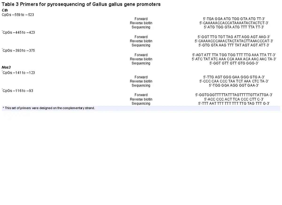 Another cohort of frozen abdominal aortas isolated from chicken embryos from normoxic and hypoxic incubations untreated and treated with NAC (n = 5 embryos in each group) was used for DNA methylation studies. The methylation status of the promoter region of the CTH and NOS3 genes Gallus gallus was determined using DNA bisulfite modification coupled with DNA sequencing, employing established techniques as previously described (Krause, Costello et al., ; Teichert et al., ). DNA was isolated from ∼10−6 EC using a DNeasy Blood & Tissue Kit (Qiagen, Hilden, Germany) and 500 ng of total DNA extracts were treated with sodium bisulfite using EpiTect Bisulfite Kit (Qiagen). Promoter regions of the CTH and NOS3 genes were amplified by PCR using specific primers for CTH and NOS3 (Table 3). Average core promoter and site‐specific CpG methylations were determined as a percentage using a PyroMark Q96 MD (Qiagen).