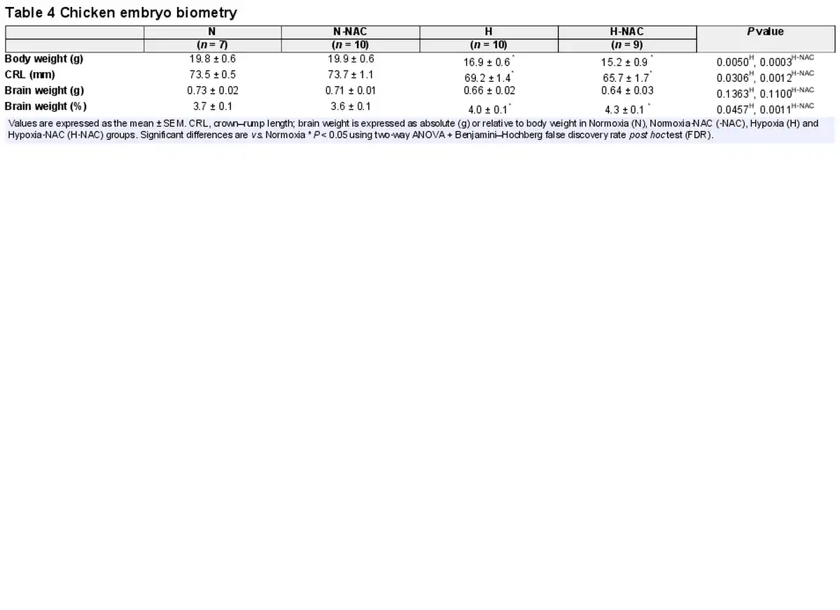 Relative to controls, infants from FGR pregnancies had significantly lower birth weights and values for body length (Table 1). Relative to controls, chicken embryos incubated under hypoxic conditions showed reduced body weight and an increase in brain weight when expressed as a percentage of body weight, indicating asymmetric growth restriction with evidence of brain sparing. Treatment of hypoxic chicken embryos with NAC did not prevent this effect (Table 4).