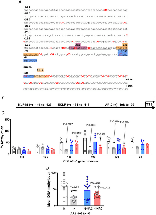 A, Gallus gallus NOS3 gene promoter and first exon sequence (−504 bp from the transcription start site), obtained from the Ensembl genome browser. The binding sites are highlighted, and the related transcription factor is shown above. B, schematic diagram of the G. gallus NOS3 gene promoter predicted with MatInspector. C, dot plots over the mean ± SEM for single‐CpG methylation levels across the NOS3 proximal promoter. D, mean DNA methylation levels in AP‐2 site located at −108 to −92 upstream for abdominal aortas isolated from chicken embryos. Groups are normoxic (N; n = 5), hypoxic (H; n = 5), normoxic treated with NAC (N‐NAC; n = 5) and hypoxic treated with NAC (H‐NAC; n = 5) chicken embryos. Significant differences are vs. N (*P < 0.05 and ***P < 0.001) or H vs. H‐NAC (†P < 0.05) using two‐way ANOVA + Benjamini–Hochberg FDR. [Colour figure can be viewed at wileyonlinelibrary.com]
