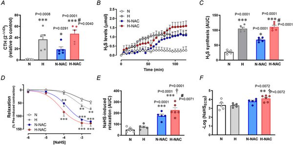 Top: CTH transcripts levels (A), hydrogen sulphide formation (H2S) (B) and the cumulative H2S synthesis [area under the curve (AUC)] (C) in abdominal aortas isolated from near‐term chicken embryos incubated under normoxic (N; n = 5 embryos), hypoxic (H; n = 5 embryos), normoxic with NAC treatment (N‐NAC; n = 5 embryos) or hypoxic with NAC treatment (H‐NAC; n = 5 embryos) conditions. Bottom: relaxant responses to the H2S donor NaHS (D), the cumulative vasodilatation (AUC) (E) and potency (–logEC50) (F) in femoral arteries isolated from near‐term chicken embryos incubated under normoxic (N; n = 5 embryos), hypoxic (H; n = 5 embryos), normoxic with NAC treatment (N‐NAC; n = 5 embryos) or hypoxic with NAC treatment (H‐NAC; n = 5 embryos) conditions. Significant differences are vs. N (*P < 0.05, **P < 0.01, ***P < 0.001), H vs. H‐NAC (#P < 0.05) and N‐NAC vs. H‐NAC (†P < 0.05) using two‐way ANOVA + Benjamini–Hochberg FDR. [Colour figure can be viewed at wileyonlinelibrary.com]