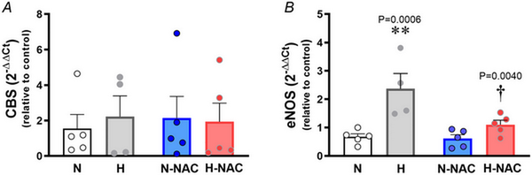 Values are dot plots over the mean ± SEM for mRNA levels of cystathionine‐β‐synthase (CBS) (A) and mRNA levels of endothelial nitric oxide synthase (eNOS) (B) in abdominal aortas isolated from chicken embryos. Groups are normoxic (N; n = 5), hypoxic (H; n = 5), normoxic treated with NAC (N‐NAC; n = 5) and hypoxic treated with NAC (H‐NAC; n = 3) chicken embryos. Significant differences are vs. N (**P < 0.01) and H vs. H‐NA (†P < 0.05) using two‐way ANOVA + Benjamini–Hochberg FDR. [Colour figure can be viewed at wileyonlinelibrary.com]