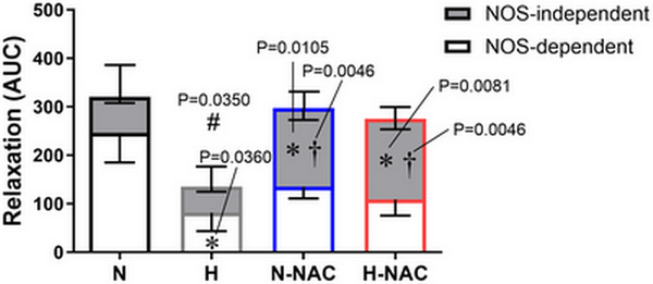 The bar chart represents the mean ± SEM for the area under the curve (AUC) for the relaxation to methacholine in the absence and presence of the NOS‐inhibitor L‐NAME in femoral arteries isolated from chicken embryos incubated under normoxic (N; n = 5–7 embryos), hypoxic (H; n = 5–7 embryos), normoxic with NAC treatment (N‐NAC; n = 5–7 embryos) or hypoxic with NAC treatment (H‐NAC; n = 5–8 embryos) conditions. The overall histogram with positive SEM represents the overall relaxation. The grey compartmental histogram with negative SEM represents the AUC for NOS independent mechanisms. The white compartmental histogram with negative represents the AUC for NOS‐dependent mechanisms. Significant differences are vs. the corresponding component in N (*P < 0.05) vs. the corresponding component in H (†P < 0.05) and vs. the total AUC in N (#P < 0.05) using two‐way ANOVA + Benjamini–Hochberg FDR. [Colour figure can be viewed at wileyonlinelibrary.com]