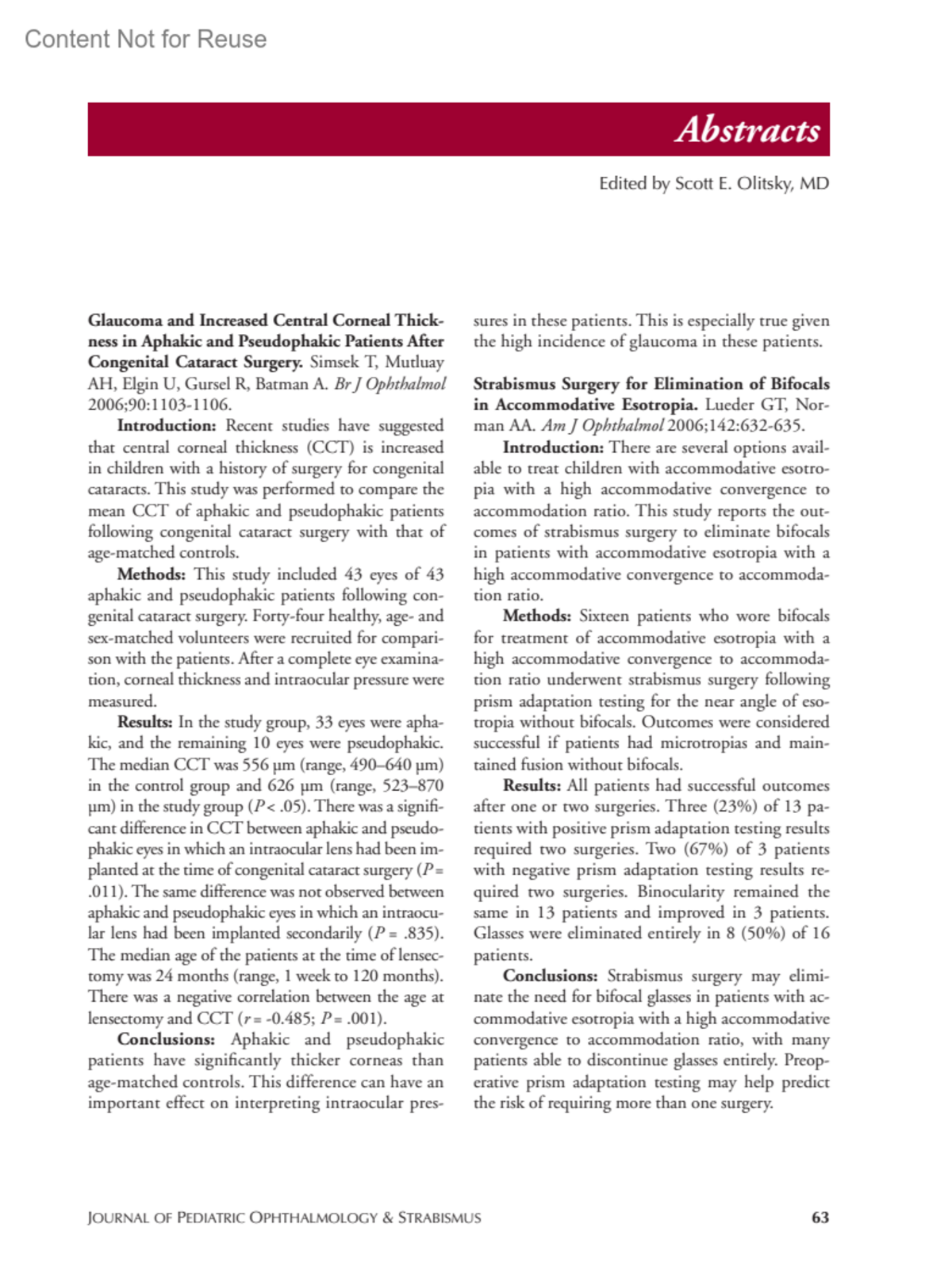 Strabismus Surgery for Elimination of Bifocals in Accommodative EsotropiaLueder, G TNorman, A AJournal of Pediatric Ophthalmology & Strabismus 44(1):p 63, January-February 2007.Copyright © 2007 SLACK Incorporated