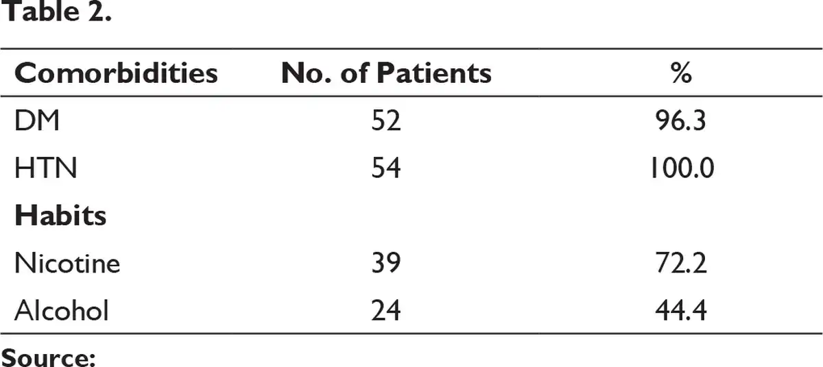 Diabetes mellitus and hypertension were associated with 96.3% and 100%, respectively, that is, all the study subjects were hypertensives. Alcohol and nicotine consumption was associated with 44.4% and 72.2% individuals, respectively (Table 2). All the individuals had positive family history of medical conditions.