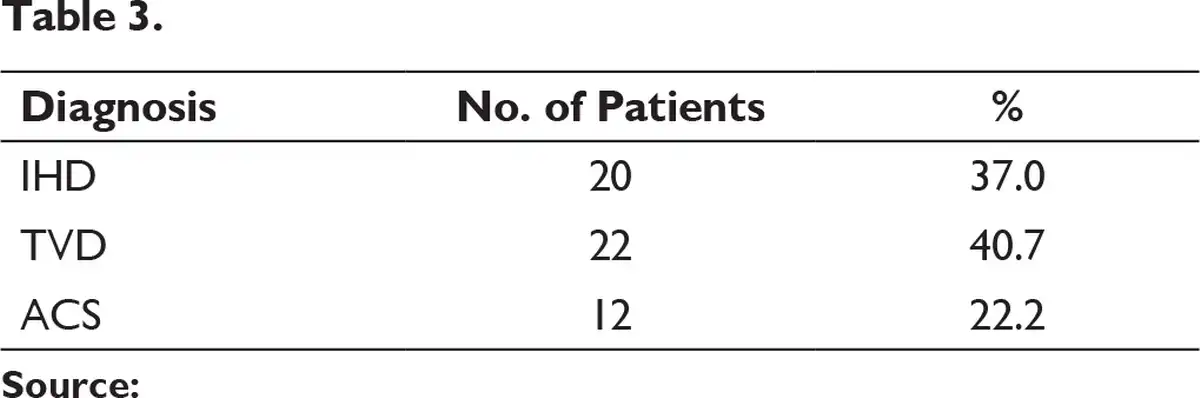 Initially, 57 patients were considered for the study; later because of the mortality, the final number of individuals considered was 54. Individuals diagnosed with ischemic heart disease (IHD), acute coronary syndromes, and triple vessel disease were included for the study. The diagnosis was made by the concerned ECG changes and cardiac biomarkers, and confirmed by the attending cardiologist. The interview was conducted once the patient was stabilized and was physically fit to participate in the study and before discharge.