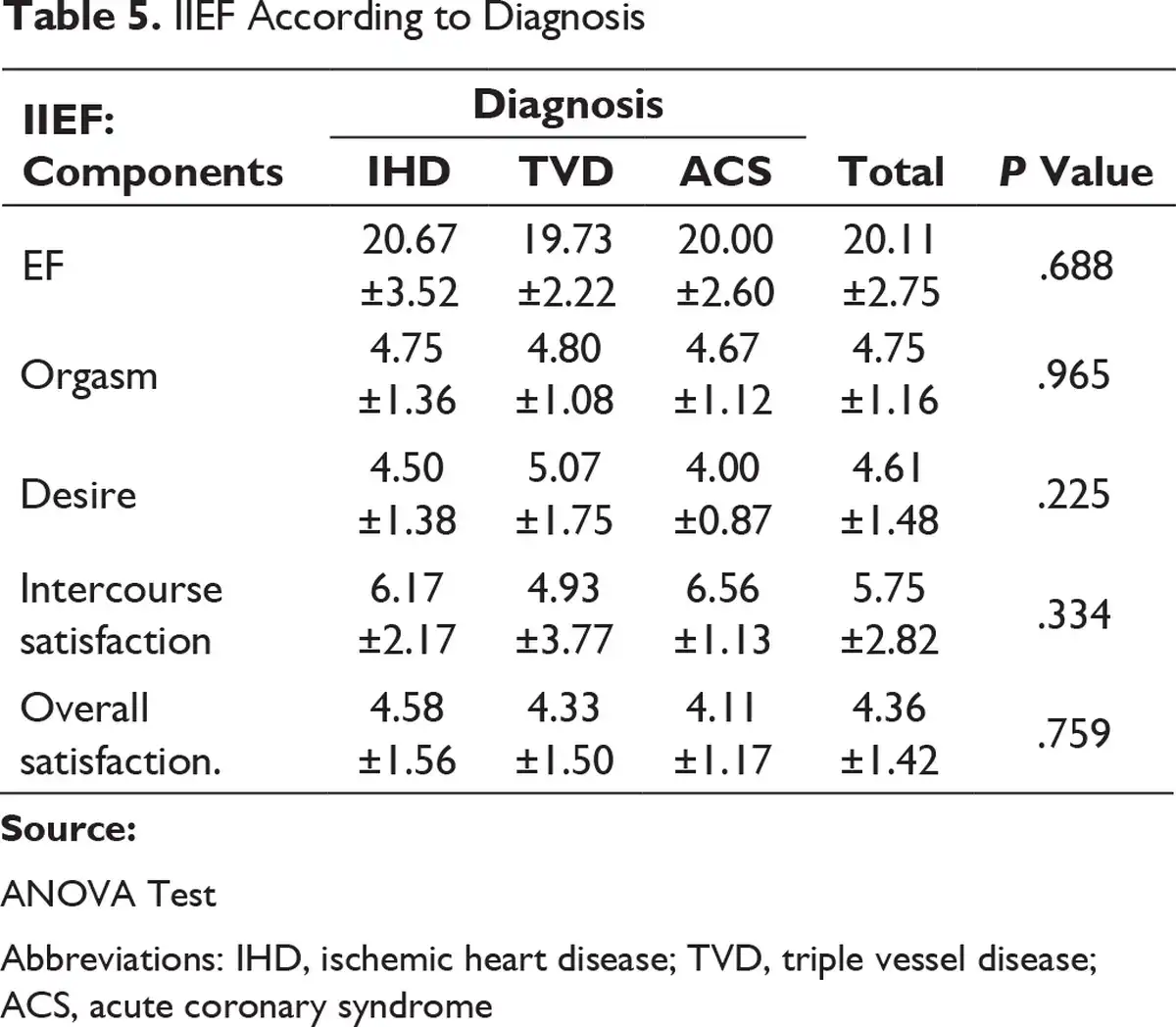 Among males, 69.4% had Mild ED followed by 27.8% having mild to moderate dysfunction and 2.8% had no difficulties. A total of 52.8% had moderate dysfunction and 41.7% had mild to moderate dysfunction followed by 5.6% having mild orgasmic dysfunction. A total of 44.4% had moderate desire problems followed by 41.7% having mild to moderate problems and 11.1% had mild problem followed by 2.8% having severe desire problems. A total of 50% had mild to moderate dysfunction in intercourse satisfaction, followed by 33.3% and 16.7% having moderate and severe dysfunction, respectively. A total of 44.4% had moderate and mild to moderate dysfunction in intercourse satisfaction, followed by 5.6% of the individuals having mild and severe dysfunction. This was consistent with the study conducted by Seyed Khalil Forouzannia et al, on sex hormone levels and sexual dysfunction in men after CABG.