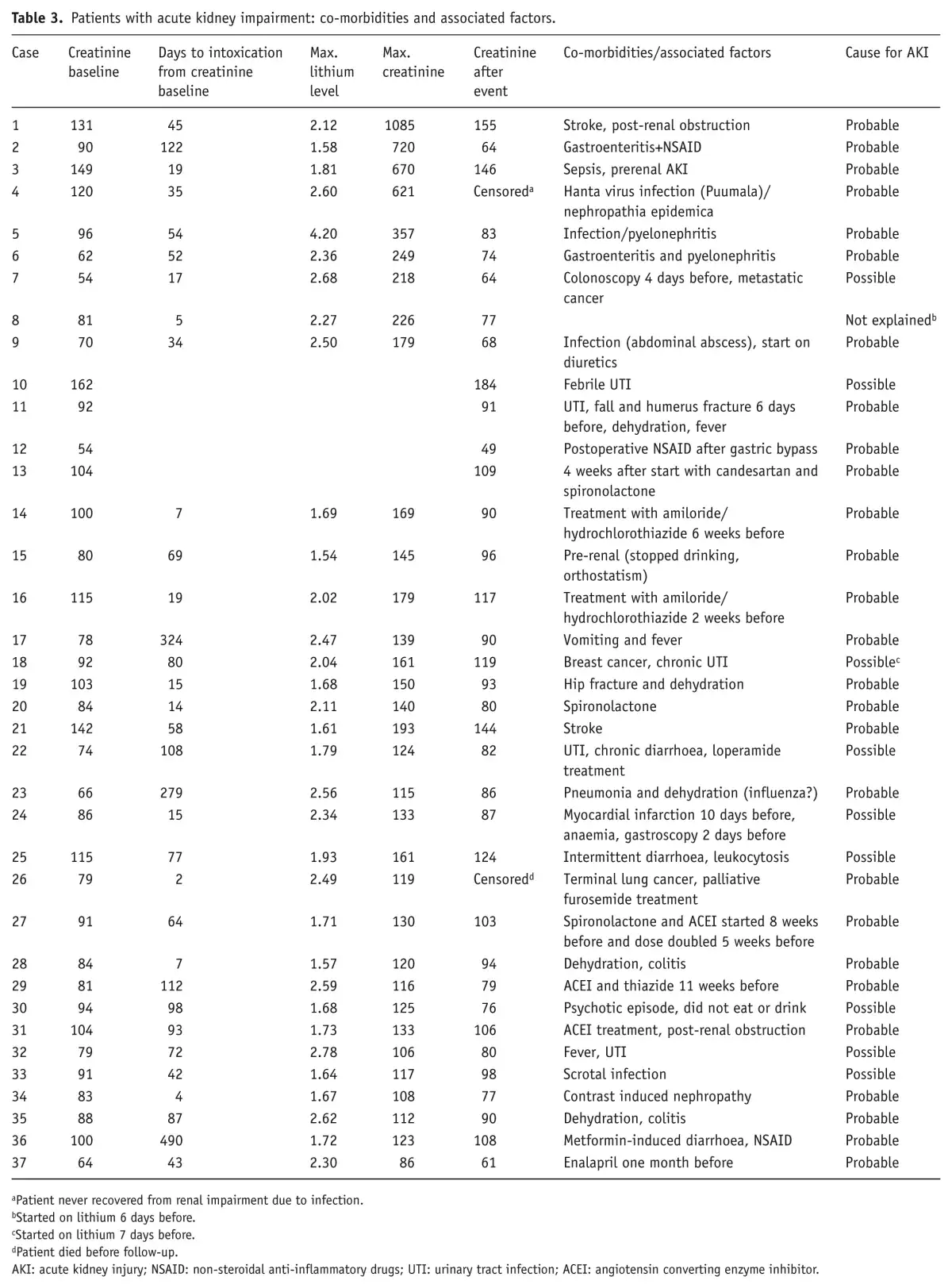 In this study, we did not follow up on renal function longer than the next measurement of creatinine after at least one month; whether lithium intoxication leads to increased vulnerability and higher risk of risk of long-term decline of renal function was not addressed.