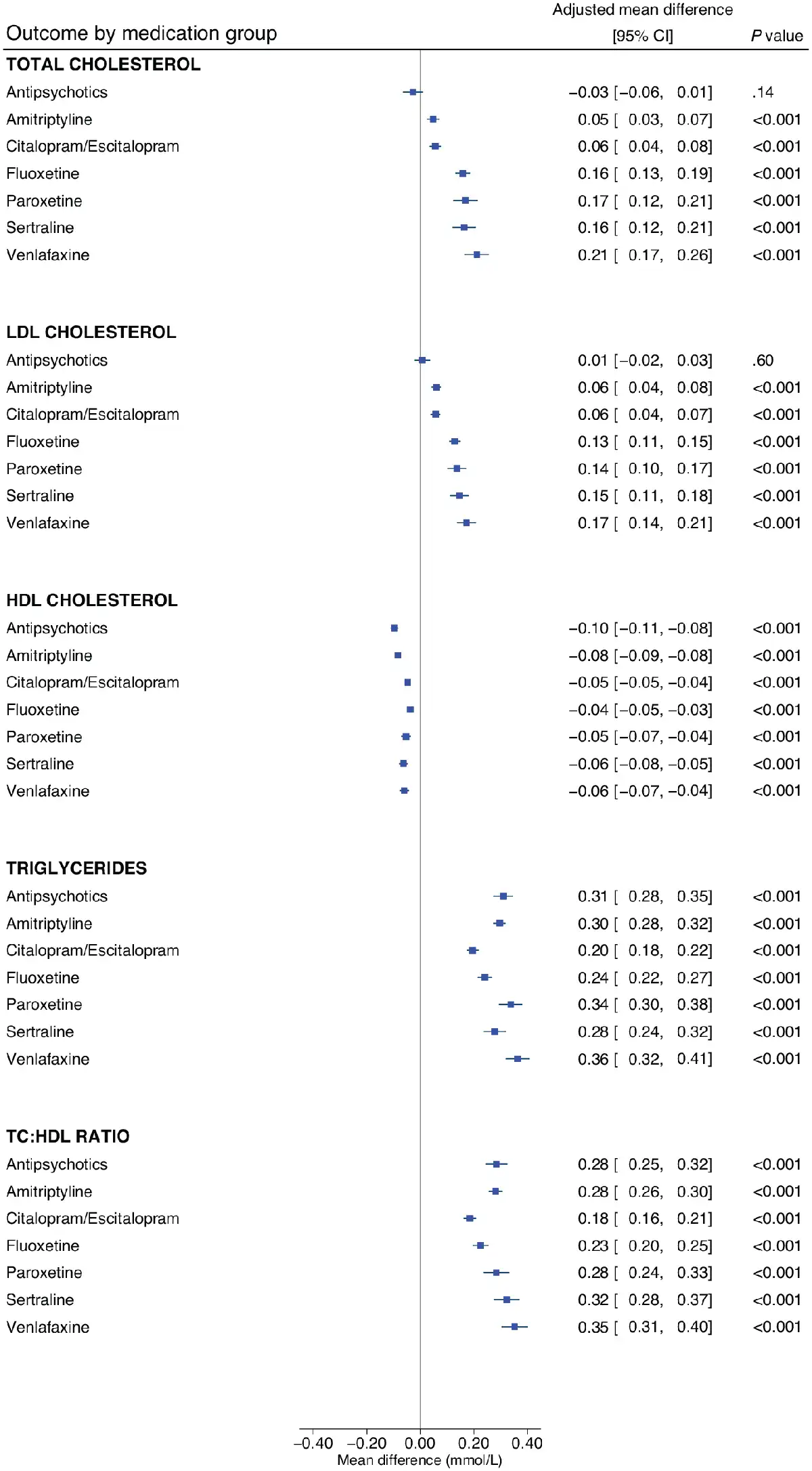 Venlafaxine was associated with the highest levels of total cholesterol (mean difference: 0.21 mmol/L, 95% CI: 0.17 to 0.26, p < 0.001), followed by paroxetine (0.17 mmol/L, 95% CI: 0.12 to 0.21, p < 0.001) and sertraline (0.16 mmol/L, 95% CI: 0.12 to 0.21, p < 0.001). A similar pattern was observed for LDL-C. The lowest HDL-C levels were observed with antipsychotics and with amitriptyline (−0.08 mmol/L, 95% CI: −0.09 to −0.08, p < 0.001). The highest triglyceride levels were observed with venlafaxine (0.35 mmol/L, 95% CI: 0.31 to 0.40, p < 0.001) and sertraline (0.32 mmol/L, 95% CI: 0.28 to 0.37, p < 0.001). Results were similar when excluding participants taking any other antidepressants/antipsychotics from the reference group (Supplemental Table 4).