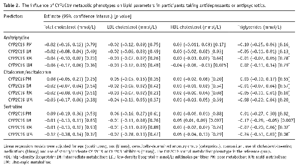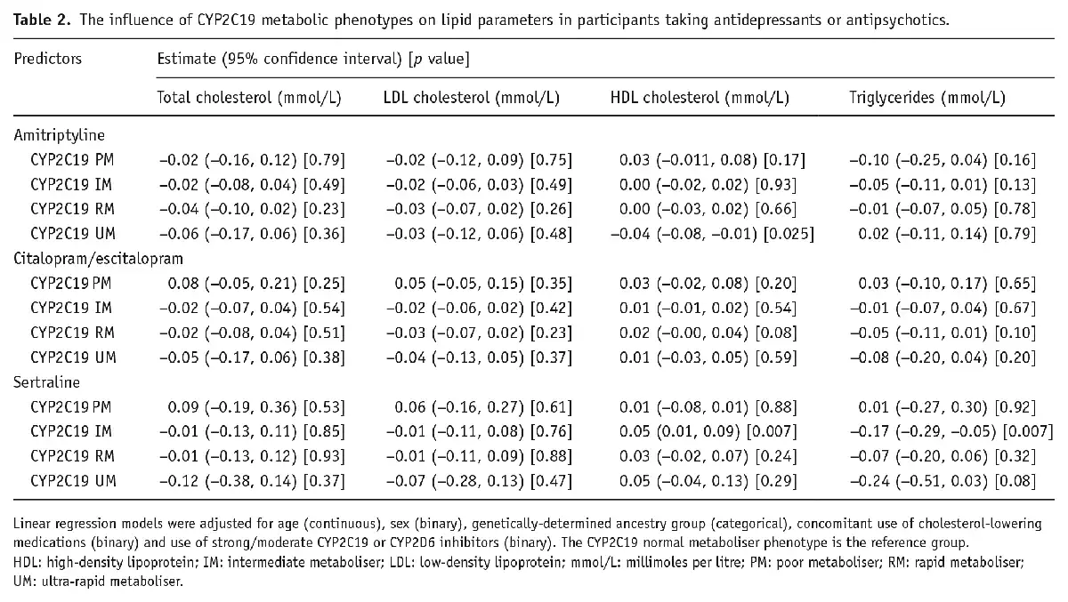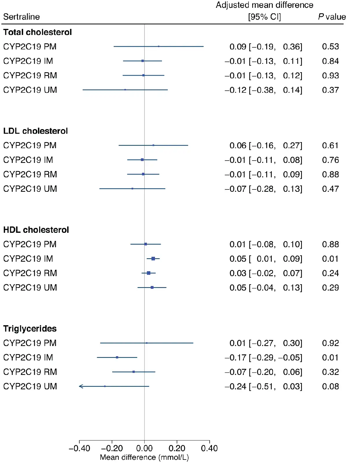 The influence of CYP2C19 metabolic phenotypes on lipid parameters in participants taking sertraline.