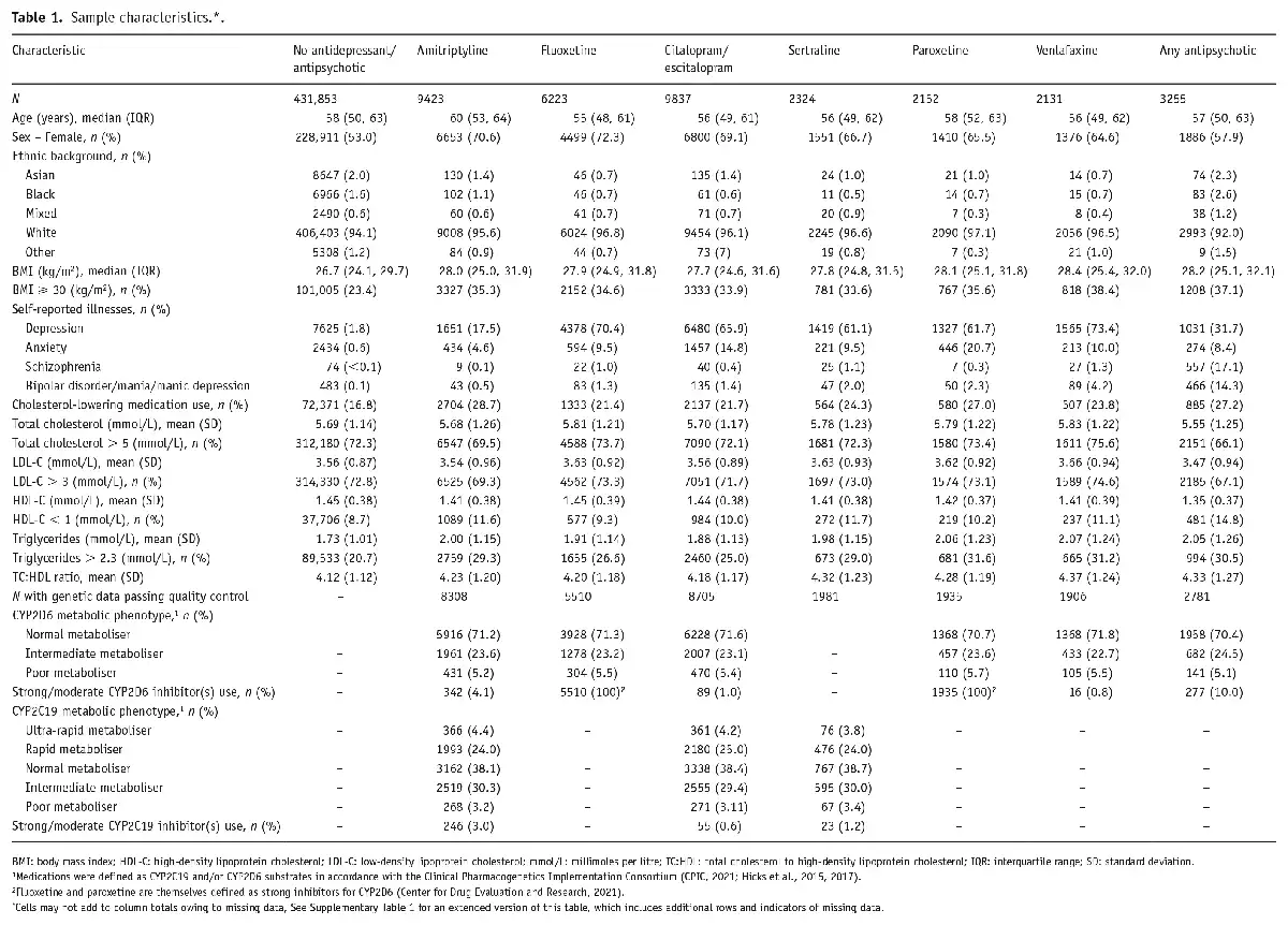 In this population-based, observational, cohort study using genetic and cross-sectional data on 469,739 participants from UK Biobank, we found that the use of amitriptyline, citalopram/escitalopram, fluoxetine, paroxetine, sertraline and venlafaxine were each all significantly associated with adverse levels of total cholesterol, LDL-C, HDL-C and triglycerides. In participants taking sertraline, we found that the CYP2C19 intermediate metaboliser phenotype was significantly associated with higher HDL-C and lower triglycerides. Antipsychotic use was significantly associated with lower HDL-C and higher triglycerides.