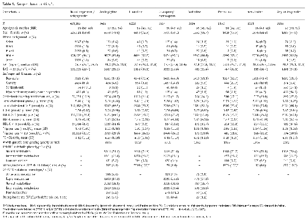 In addition to lipid parameters, across each medication group – we described participants’ age at recruitment (years), sex, self-reported ethnic background, body mass index (BMI) (kg/m2), selected self-reported illnesses (depression, anxiety, schizophrenia, bipolar disorder) and concomitant use of cholesterol-lowering medications. We reported proportions for each lipid parameter using national categories (). We included a comparison group of participants not taking medications of interest. In participants with high-quality genetic data that reported taking antidepressants/antipsychotics, we reported distributions of genetically-determined ancestry group, CYP2C19 and CYP2D6 metabolic phenotypes and use of strong/moderate inhibitors (as per United States Food and Drug Administration) (). Means with standard deviations, medians with interquartile ranges and/or counts and proportions were used, as appropriate.