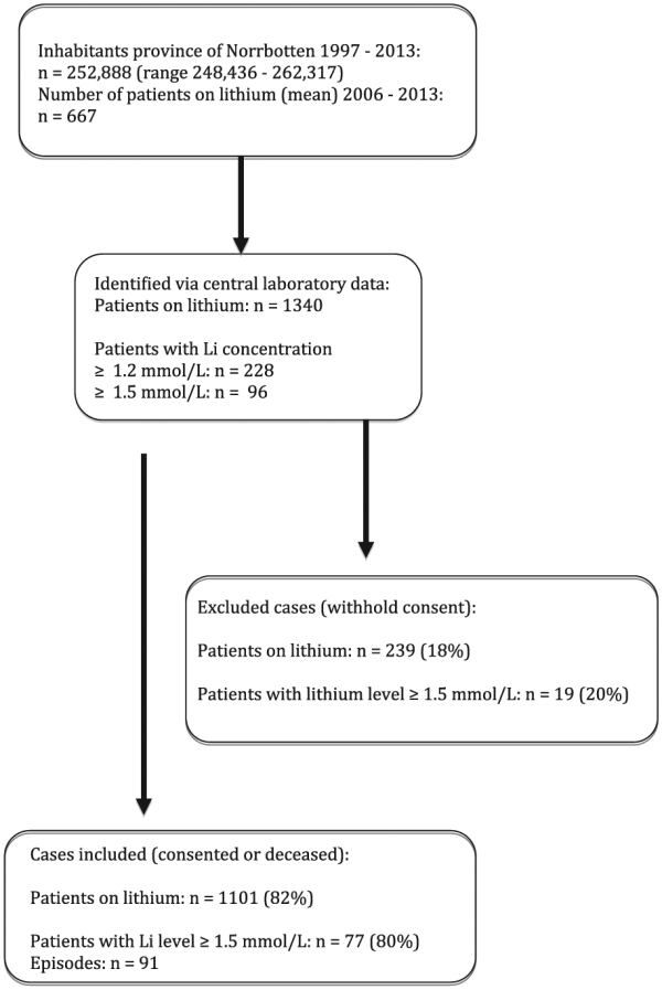 We identified 1340 patients who had been exposed to lithium over the 17-year period of observation. Of these, 228 had experi-enced at least one episode of lithium levels ≥1.2 mmol/L, and 96 (7.16%) had experienced at least one episode of lithium levels ≥1.5 mmol/L. The mean number of patients treated with lithium between 2006 and 2013 in the catchment area was 667 per year, corresponding to 2.67 patients/1000 inhabitants, according to national prescription data. These numbers were stable over the observation period. Our study covered an estimate of 11,339 patient-years on lithium. Under the assumption that the patients not consenting to have their charts reviewed had a similar distribution of episodes, the incidence of moderate to severe lithium intoxication amounted to 0.01 patients per year.