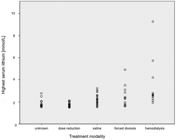 Severe to moderate cases of lithium intoxication are rare. If they occur, they can be managed safely in most cases. AKI occurs, but sustained loss of renal function is rare. In our study, in the majority of cases, renal impairment was most likely a cause rather than a consequence of lithium intoxication. Intensive care may be needed. Both intermittent HD and CVVHD can be used, but the clearance of CVVHD can be too low in cases where large amounts of lithium have been ingested. Both volume expansion with saline and forced diuresis have been used and are safe. As lithium can cause irreversible neurotoxic effects, it makes sense intuitively to remove lithium assertively, since HD has a low complication rate.