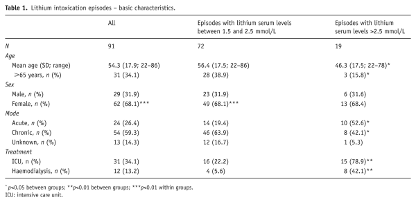 Seventy-two (79%) episodes concerned moderate plasma elevations in the range 1.50–2.5 mmol/L, and 19 (21%) episodes concerned severe plasma elevations >2.5 mmol/L. The highest lithium level detected was 9.26 mmol/L in the context of an intentional overdose. In all groups, women accounted for about two-thirds of intoxication episodes (p<0.01). The mean age for all these episodes was 54.3 years (SD=17.9 years, range 22–86 years). Patients with severe intoxication were significantly younger (p< 0.05; Table 1).
