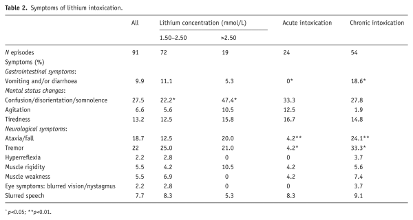 Symptoms of lithium intoxication were only recorded for a minority of patients. Most commonly, patients presented with altered level of consciousness (confusion, disorientation or somnolence). This was significantly more likely to occur in patients with severe intoxication (p<0.05). Less likely to occur in an acute overdose setting were tremor (p<0.05), vomiting and diarrhoea (p<0.05) and ataxia or falls (p<0.001) (see Table 2).