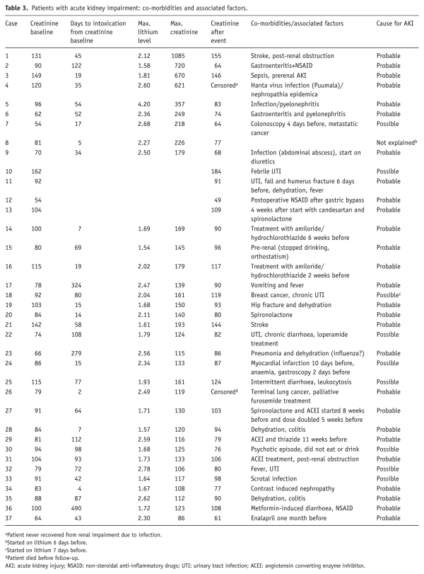 Regarding each episode of lithium intoxication eligible for review, we determined the mode of detection, presenting symptoms, somatic co-morbidities and co-medications, aetiology, treatment including need for dialysis, clinical outcome and renal function before and at least one month after lithium intoxication. Episodes with acute intoxication, defined as cases of supra-therapeutic lithium doses leading to toxic blood levels within 24 hours after ingestion, were classified as ‘acute’ in lithium naive patients and ‘acute on therapeutic’ in patients on lithium maintenance treatment. Cases in whom recent supra-therapeutic doses had been ruled out were defined as ‘chronic’. We used estimated glomerular filtration rate (eGFR) as a more reliable parameter of renal function than creatinine for baseline and one month after intoxication. eGFR was estimated with the CKD-EPI formula (). For acute kidney injury (AKI), we used creatinine, since eGFR would render false results. AKI was defined as a rise in creatinine ≥26.5 µmol/L/48 hours, according to the ). Baseline creatinine was defined as last creatinine measured before intoxication or occurrence of the relevant co-morbidity (e.g. infection). Co-morbidities and associated factors were classified according to the likelihood of causing AKI. Such were considered ‘probable’ if the clinical data showed patterns that would induce AKI in a lithium-naive patient. Episodes with co-morbidities essentially able to cause AKI but without enough clinical information were considered ‘possible’. All information was then entered into a database and anonymised before analysis.