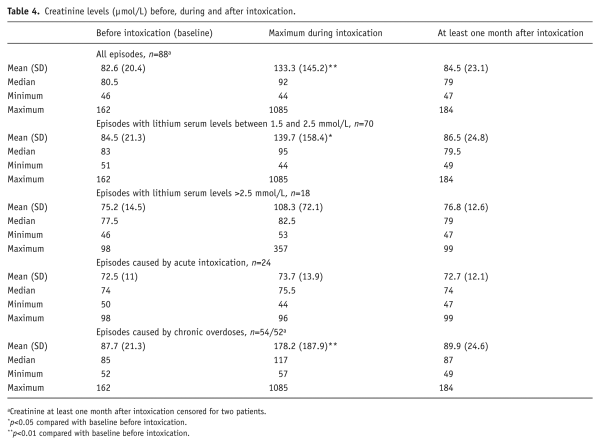In this study, we did not follow up on renal function longer than the next measurement of creatinine after at least one month; whether lithium intoxication leads to increased vulnerability and higher risk of risk of long-term decline of renal function was not addressed.