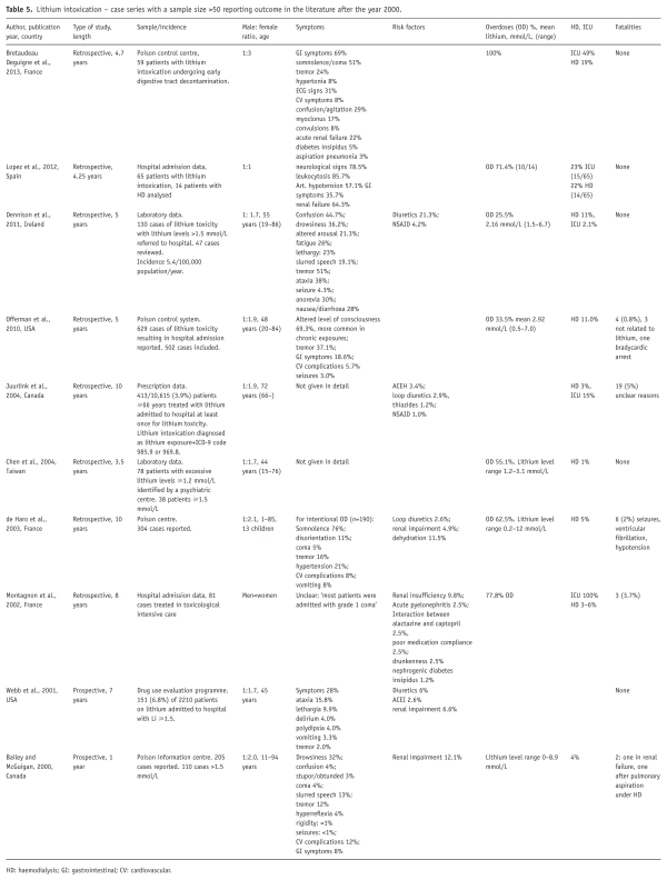 Lithium intoxication is potentially life-threatening. Large case series from poison-control centres (PCC) report neurological or cardiac causes (; ) or renal failure and aspiration pneumonia () for fatal outcomes. It is difficult to deduct mortality rates from PCC data due to selection bias and high variability in severity. Published case series investigating mortality on the base of hospital admission data or laboratory data (; ; ) did not report any deaths in 236 cases. had a much higher mortality in a cohort of elderly patients identified from prescription data, but it remains unclear how many fatalities were caused by lithium. Despite the life-threatening potential of lithium intoxication, only a minority will require treatment with HD, and surprisingly few result in death (Table 5).