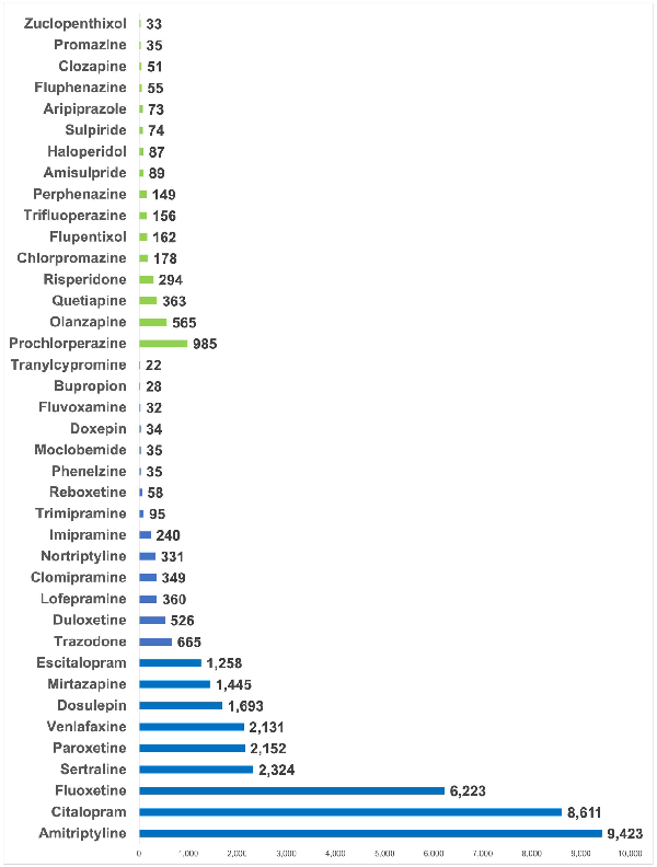 Overall, 469,739 participants had data for at least one lipid parameter. Of these, 36,043 reported taking at least one antidepressant, 3255 at least one antipsychotic, while 431,853 did not take either. Use of both an antidepressant and an antipsychotic was reported by 1412 participants. A wide range of medications were reported – with amitriptyline, citalopram and fluoxetine the most common antidepressants and prochlorperazine, olanzapine and quetiapine the most common antipsychotics (Figure 1). Amitriptyline, fluoxetine, citalopram/escitalopram, paroxetine, sertraline and venlafaxine met sample size threshold for individual medication analyses. No individual antipsychotic met threshold; all reported antipsychotics were therefore analysed together. Of participants taking antidepressants/antipsychotics, 33,472 had high-quality genetic data.