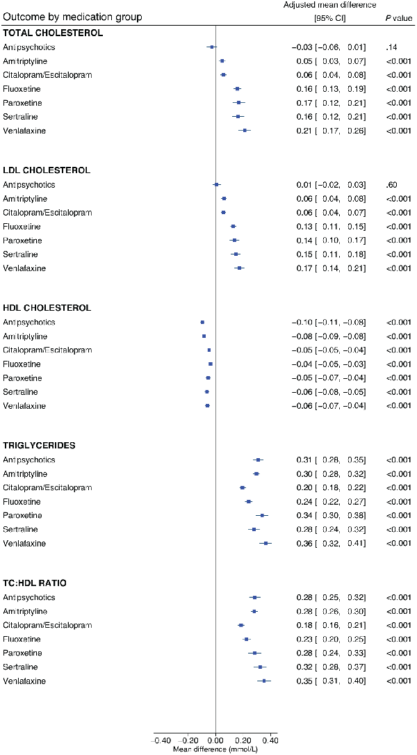 Venlafaxine was associated with the highest levels of total cholesterol (mean difference: 0.21 mmol/L, 95% CI: 0.17 to 0.26, p < 0.001), followed by paroxetine (0.17 mmol/L, 95% CI: 0.12 to 0.21, p < 0.001) and sertraline (0.16 mmol/L, 95% CI: 0.12 to 0.21, p < 0.001). A similar pattern was observed for LDL-C. The lowest HDL-C levels were observed with antipsychotics and with amitriptyline (−0.08 mmol/L, 95% CI: −0.09 to −0.08, p < 0.001). The highest triglyceride levels were observed with venlafaxine (0.35 mmol/L, 95% CI: 0.31 to 0.40, p < 0.001) and sertraline (0.32 mmol/L, 95% CI: 0.28 to 0.37, p < 0.001). Results were similar when excluding participants taking any other antidepressants/antipsychotics from the reference group (Supplemental Table 4).