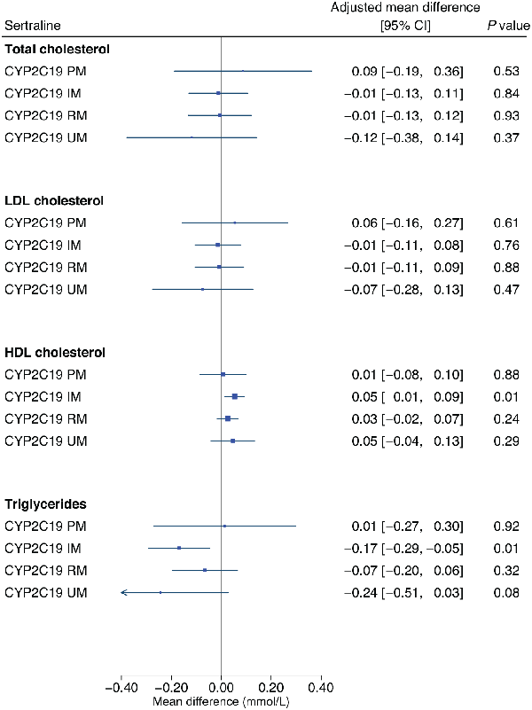 Adjusted estimates of the influence of CYP2C19 and CYP2D6 metabolic phenotypes on lipid parameters across each medication group are shown in Table 2 and Supplementary Table 6, respectively. In participants taking sertraline, the CYP2C19 intermediate metaboliser phenotype was significantly associated with an average 0.05 mmol/L higher HDL-C (95% CI: 0.01 to 0.09, p = 0.007) and with an average 0.17 mmol/L lower triglyceride level (95% CI: −0.29 to −0.05, p = 0.007), compared with normal metabolisers (Figure 3). As significant associations were in an unanticipated direction, we undertook post hoc analyses exploring the impact of cholesterol-lowering medications (Supplementary Table 8). Extension of the sertraline HDL-C model to include an interaction term for CYP2C19 metabolic phenotype by cholesterol-lowering medications resulted in a main effect of the intermediate metaboliser phenotype larger than the primary analysis (0.08 mmol/L, 95% CI: 0.03 to 0.12, p = 0.001), with an intermediate metaboliser phenotype by cholesterol-lowering medications interaction effect in the opposite direction (−0.10 mmol/L, 95% CI: −0.19 to −0.01, p = 0.03, n = 126). Stratified analysis revealed a statistically strong effect of the CYP2C19 intermediate metaboliser phenotype in participants not taking cholesterol-lowering medications (0.08 mmol/L, 95% CI: 0.03 to 0.12, p = 0.001, n = 424), but no evidence in those taking them. There was no evidence of an interaction in the extended triglycerides model, but some evidence in stratified analysis of a stronger association in participants not taking cholesterol-lowering medications (−0.15 mmol/L, 95% CI: −0.29 to −0.02, p = 0.03, n = 456).