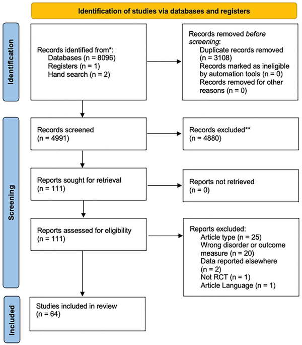 The initial search identified 8097 papers. After removal of duplicates, 4989 studies underwent initial title and abstract screening leaving 109 studies for full-text review. Review of full-text articles excluded 49 articles for the following reasons: article type (7 review or meta-analysis papers and 18 conference abstracts or posters), wrong disorder or outcome measure (20), data reported elsewhere (2), not a randomized control trials study (1), and article language (1). Two further studies were added from hand searching after the original search. In total, 64 studies were included (52 animal studies and 12 human studies), and details are outlined in Figure 1.