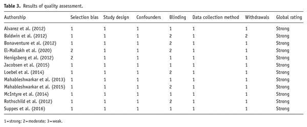Overall, the clinical trials included in this systematic review were assessed to be between strong and moderate quality using the Quality Assessment Tool for Quantitative Studies, and the scores are listed in Table 3. All studies were considered to have a strong study design and strong blinding strategies. Some studies did not describe participant withdrawals and drop out, which is vital to a well described trial. Full quality assessment results for each study can be found in Table 3.