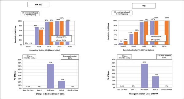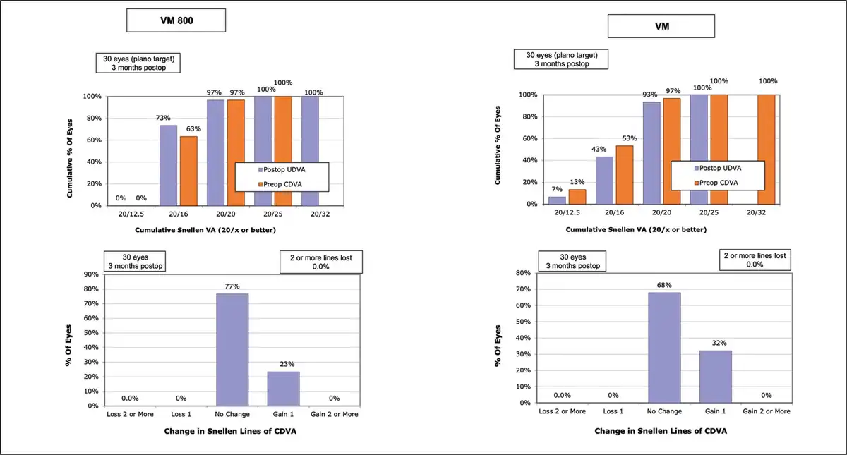 Postoperative CDVA was compared to preoperative CDVA for eyes in both groups. In the VM800 group, 23% of eyes gained one line of visual acuity, 77% of eyes remained the same, and no eyes lost any lines of CDVA. In the VM500 group, 32% of eyes gained one line of vision, 68% of eyes remained the same, and no eyes lost any lines of CDVA. There were no operative or postoperative complications such as excessive opaque bubble layer, black spots, incision or lenticule tears, suction loss, or inability to extract the lenticule, interface haze, or edema reported for any eyes in either group during this study.