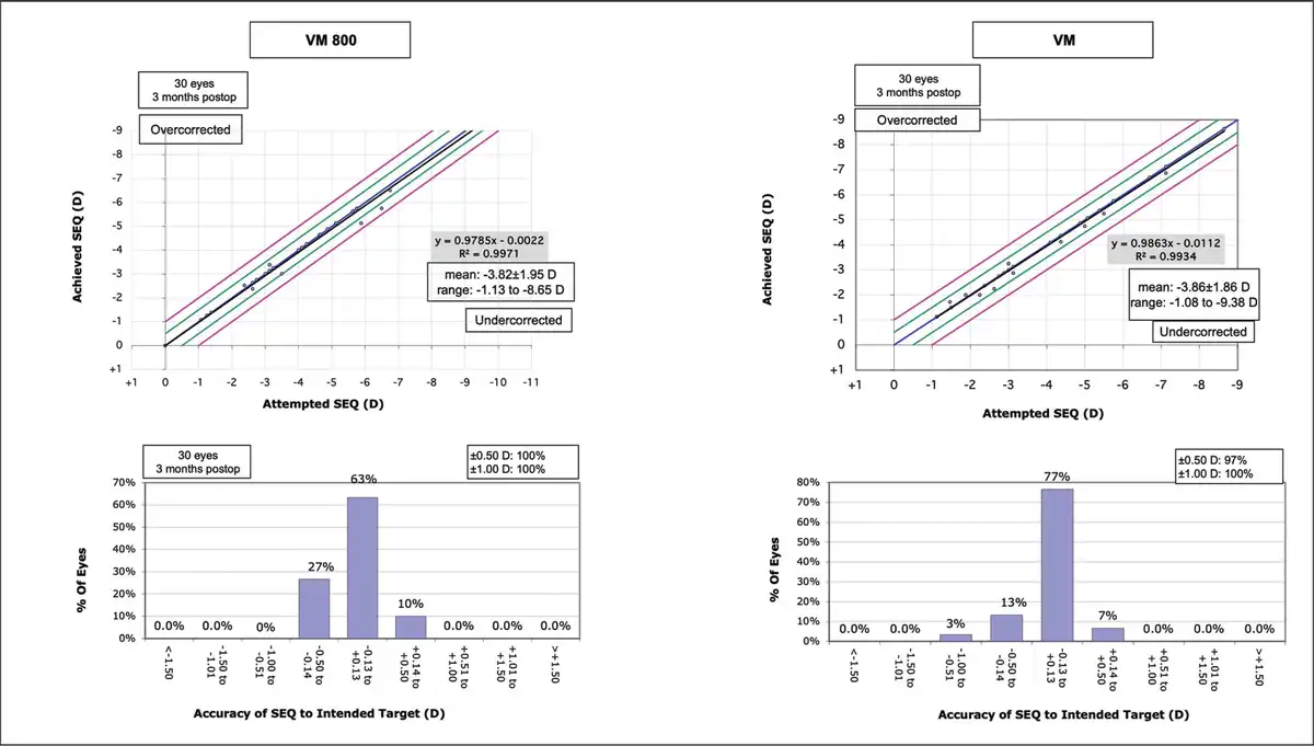 Standard graphs comparing the predicted versus achieved spherical equivalent (SEQ) (top row) and accuracy of the SEQ to the intended target (bottom row) for patients undergoing small incision lenticule extraction with the VisuMax 800 (VM800) and VisuMax 500 (VM) femtosecond lasers (Carl Zeiss Meditec). D = diopters
