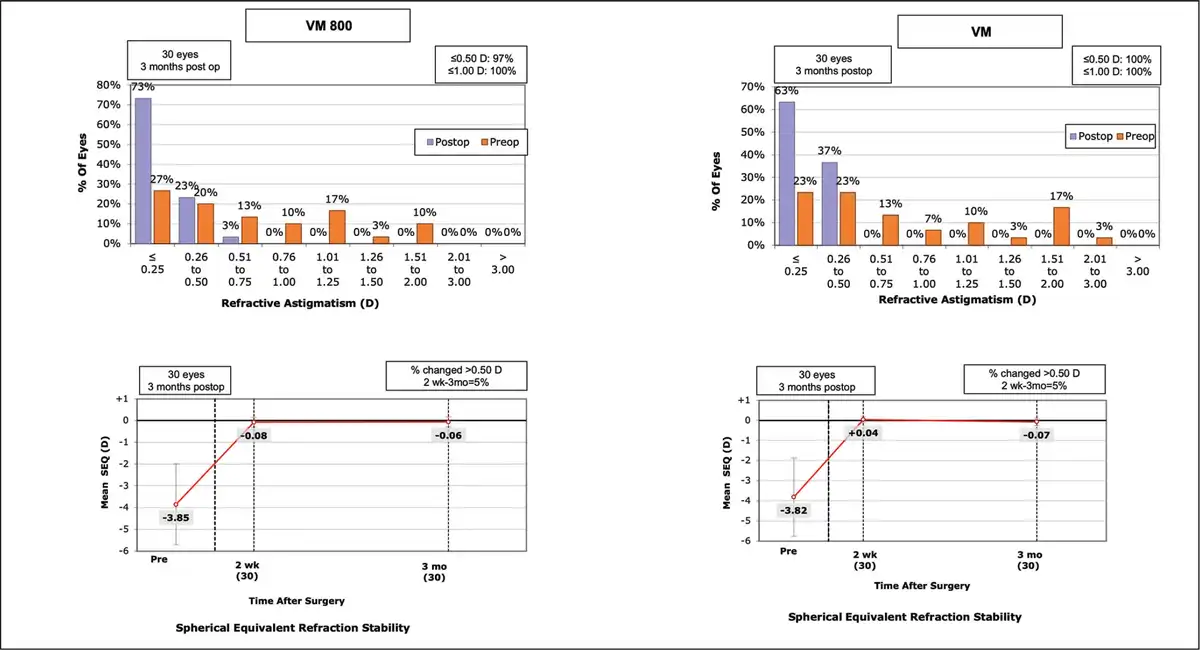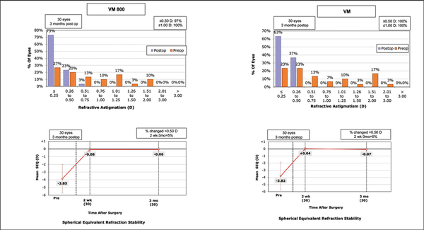Standard graphs comparing the preoperative and postoperative refractive astigmatism (top row) and stability of the spherical equivalent (SEQ) (bottom row) for patients undergoing small incision lenticule extraction with the VisuMax 800 (VM800) and VisuMax 500 (VM) femtosecond lasers (Carl Zeiss Meditec). D = diopters