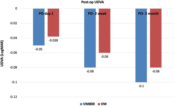 Comparison of postoperative (PO) uncorrected distance visual acuity (UDVA) at 1 day, 2 weeks, and 3 months. The VisuMax 500 (VM) and VisuMax 800 (VM800) femtosecond lasers are manufactured by Carl Zeiss Meditec.