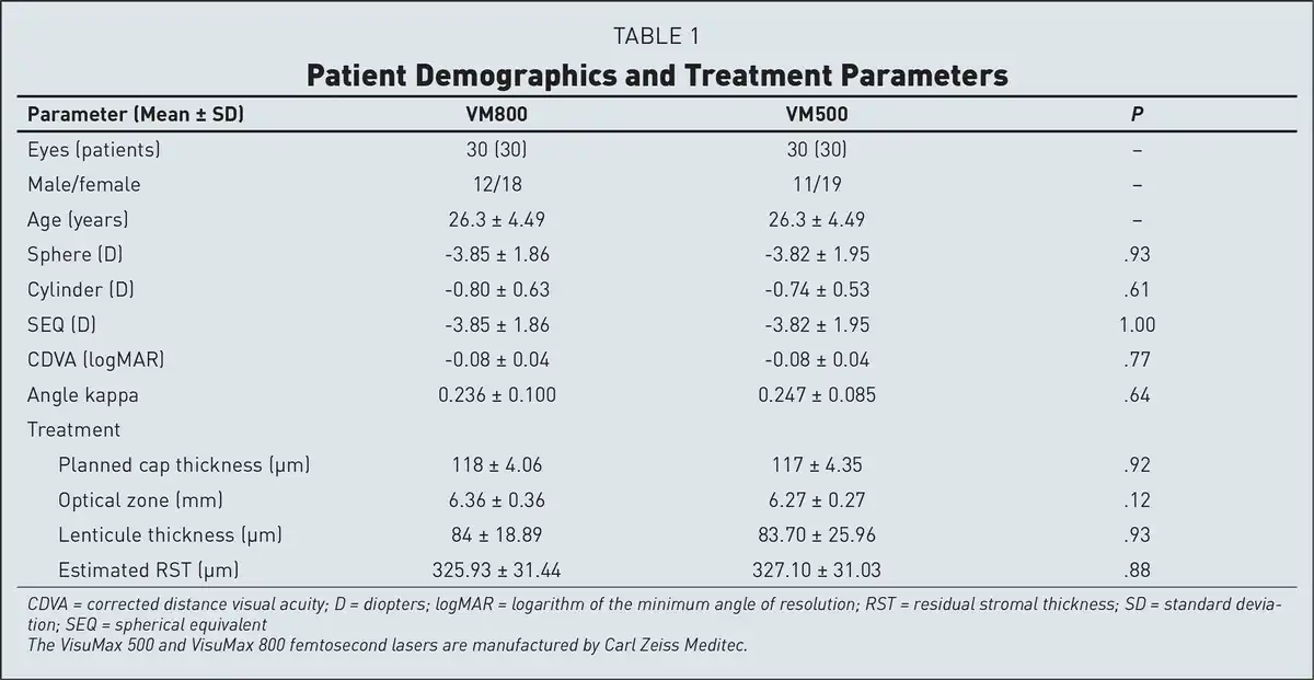 A total of 60 eyes (30 eyes treated with the VisuMax 800 [VM800 group] and 30 eyes treated with the VisuMax 500 [VM500 group]) from 30 patients who underwent bilateral SMILE between February 2022 and August 2023 were included in the study.