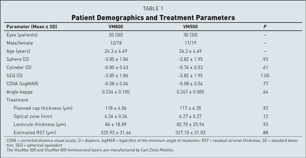 Patients enrolled in the study agreed to have one eye treated with the VisuMax 800 femtosecond laser and the contralateral eye treated with the VisuMax 500 femtosecond laser. Computer-generated randomization was used to determine which eye of the patient would receive treatment by each laser. Inclusion criteria were 21 to 40 years of age, myopia or myopic astigmatism with a spherical equivalent (SEQ) between −1.00 and −10.00 diopters (D), and manifest cylinder of 1.00 D or less, not mandating preoperative corneal marking. Exclusion criteria were eyes with corneal scars, keratoconus, pellucid marginal degeneration, pachymetry less than 480 microns, glaucoma, retinal disease, pregnancy, and medications such as immunosuppressants.