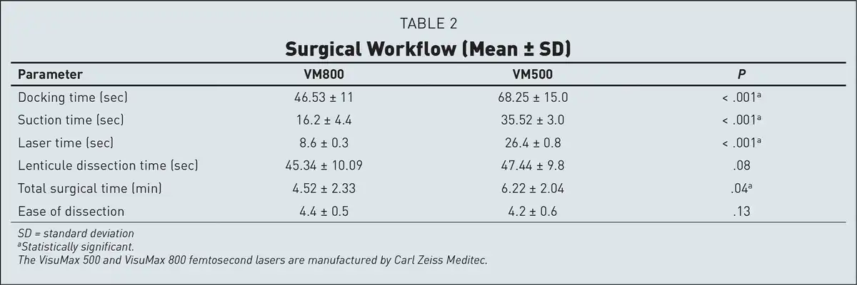 In addition to improved workflow, early reports of small incision lenticule extraction (SMILE) with the VisuMax 800 have shown excellent visual and refractive outcomes. Reinstein et al and Saad et al published data sets retrospectively evaluating their early results while noting that the results are similar to their results after SMILE with the VisuMax 500 femtosecond laser. Yoo et al performed a retrospective analysis comparing cohort of patients who underwent SMILE with the VisuMax 800 to a matched cohort of patients who underwent SMILE with the VisuMax 500. Yoo et al found that, similar to what Reinstein et al and Saad et al predicted, the outcomes between groups were similar.