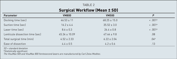 In the current study, we clearly observed a significant advantage of the VisuMax 800 laser for docking time, suction time, and overall surgical time when compared to the VisuMax 500. Of these parameters, “docking time” deserves special attention here. This time may be divided into two parts: time taken after preparation of the eye until the contact lens applanates the eye and time taken to achieve satisfactory centration and activation of suction. While comparing the VisuMax 800 with VisuMax 500, certain fundamental differences exist between the two lasers. For the execution of time taken after preparation of the eye until the contact lens applanates the eye with the VisuMax 800, one needs to lower the laser arm to applanate the cornea, whereas with the VisuMax 500, the patient bed is raised to advance the patient's eye toward the contact glass. The movement of the laser arm toward the eye is faster in comparison to the movement of the bed. The time taken to achieve satisfactory centration is aided by a centration guide based on the x and y coordinates of the pupil in the VM800 group and therefore was faster than in the VM500 group where there is no software aid available, which may result in a variable, subjective, and time-consuming centration. Accurate treatment centration is crucial to avoid visual quality issues due to the induction of HOAs. This step may be especially challenging in eyes with large angle kappa, large and decentered pupils, high corneal astigmatism, and uncooperative patients, in the absence of a centration guide. The presence of the CentraLign feature makes it easier to perform docking with greater confidence, even in the challenging situations mentioned above. Finally, the suction and laser time is clearly determined by the speed of the laser. Therefore, the VisuMax 800, with a 2-MHz pulse repetition rate and average lenticule creation time of 8 to 9 seconds, has a definite advantage over the VisuMax 500, which has a 500-KHz frequency and average lenticule creation time of 25 to 27 seconds. The significantly reduced docking, suction, and laser times appear to have contributed to shortening the overall surgical time and patient eye preference in the current study.