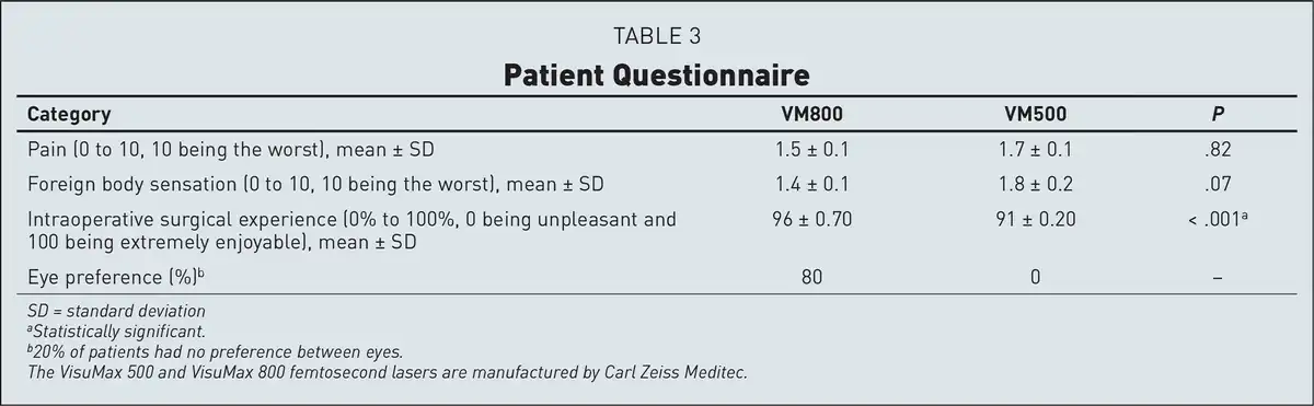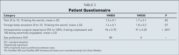There were no significant differences observed for intraoperative pain and foreign body sensation. However, overall satisfaction with the intraoperative experience was rated significantly better in the VM800 group. Patients preferred the eye that had treatment with the VM800 80% of the time and had no preference 20% of the time. No patient reported a strong preference for the VM500 eye (Table 3).